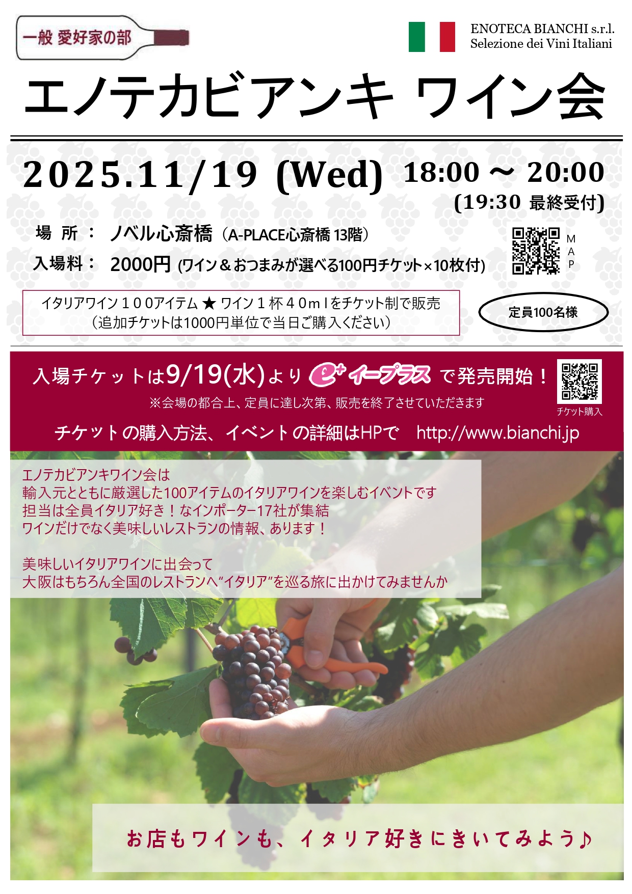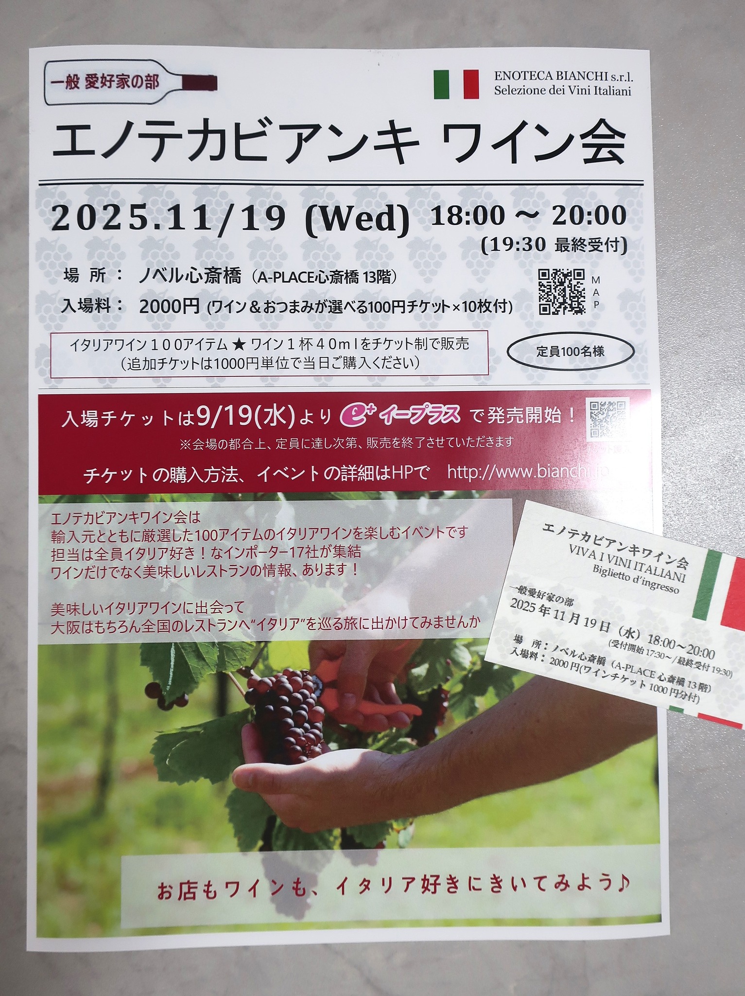 日程:令和7年 11月 19日(水) 場所:NOVEL 心斎橋 . 第一部:レストランの部(12:00~17:00予定) 第二部:一般愛好家の部(18:00~20:00予定)